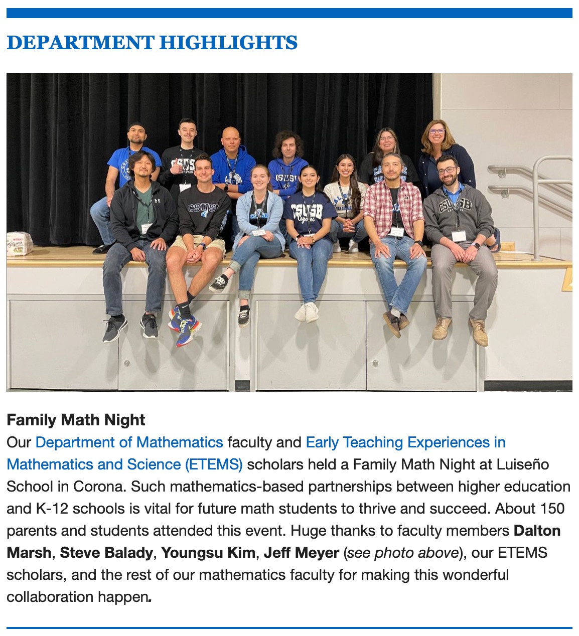 Driven by a curiosity and longing for knowledge, I was fortunate to earn a full scholarship to California State University, San Bernardino (CSUSB). Throughout my college journey, I actively engaged in campus life, participating in various volunteer opportunities, such as "Family Math Night," where I had the privilege to teach over 150 K-8th grade students and their parents problem-solving skills in math and science.